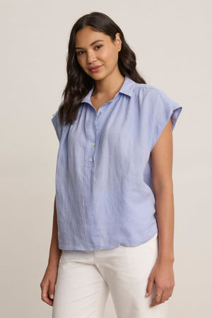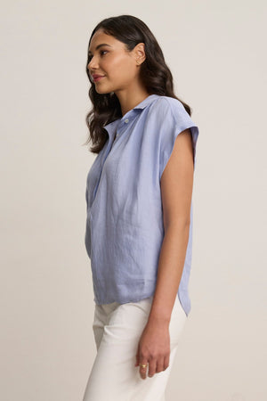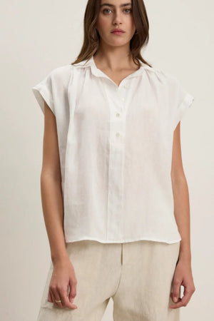 Designed with a sleeveless silhouette, classic collar, and half-button placket, this top offers timeless versatility. A relaxed fit, scooped hem, and shirred back detailing create effortless movement. Crafted from breathable woven linen, it’s the perfect blouse for any occasion.