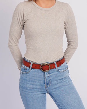 Elevate your outfits year-round with Dion, the perfect jean and dress belt. Crafted from premium buffalo leather and adorned with antique gold studs and a round buckle, Dion exudes a charming western vibe. Its versatile strap, neither too thick nor too thin, pairs effortlessly with your favorite jeans, breezy summer dresses, and more. Make a statement in any season with the Dion western belt.