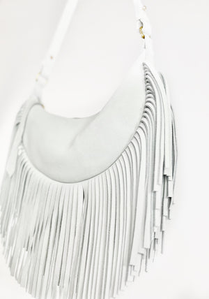 A modern nod to Western edge. This handcrafted bag reimagines our beloved Mini Crescent with hand-cut suede, bold double-layer fringe, and effortless movement. Rugged yet refined, each piece is meticulously made by skilled artisans—cut by hand, stitched with care, and designed to last for years to come.