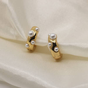 The Sylvie pearl huggie hoop earrings feature a scattering of pearls over gold for a unique twist on the classic hoop style. Perfect for adding a touch of fun and elegance to any outfit! -