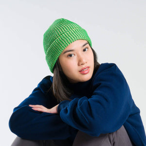 A bestselling ribbed beanie updated with a graphic grid pattern. Soft and lightweight for year-round wear. Cozy, hypoallergenic yarn and comfy, seamless construction. Can be worn as a cuffed hat or slouchy beanie. Stretches for a perfect, flattering fit on heads of all sizes.