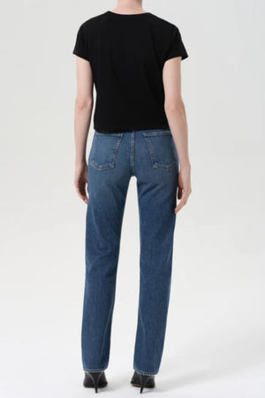 The 90’s Pinch Waist Long in Overcast features a medium to dark tinted indigo wash with soft fading and marbling for a broken-in look. Cut from lightweight comfort stretch denim, it’s designed to hold its shape while maintaining a soft, easy feel. The high-rise, straight-leg fit and 32" inseam create a clean, lengthened silhouette.