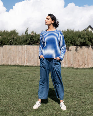 Cotton barrel-leg trousers made in a 9oz denim, washed for softness and comfort. A year-round weight fabric with a gentle structure that holds its shape while remaining easy to wear. Designed with a regular front waistband and zip fly, elasticated at the back for comfort through the day. Sits just below the natural waist, with ankle-skimming legs and subtle seam detailing at the front and back. Deep front pockets complete the shape.