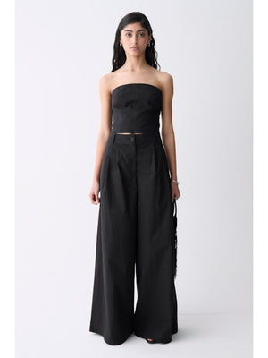 Cotton nylon wide leg pants. Side pockets and pleats on the front. Fake welt pockets and darts for shaping on the back. Belt loops. Front button and zip for closure. Pair them with the Louna top