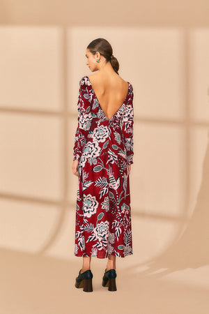 Take any occasion look up a notch with this gorgeous maxi dress by FARM Rio. Finished with ruched long sleeves, this flowing floral dress features a deep v-neckline, open back, and zipper closure. Just add boots or heels and a pair of hoop earrings.
