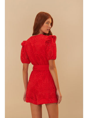 Step into elegance with the Red Eyelet Beaded Belt Romper by FARM Rio. This piece combines playful eyelet fabric with a striking V neckline, creating a silhouette that's both bold and feminine. The puffed sleeves add a touch of romance, while the intricately beaded belt cinches the waist, enhancing its playful flair. Perfect for any occasion where style and charm are paramount, this romper radiates warmth and sophistication.