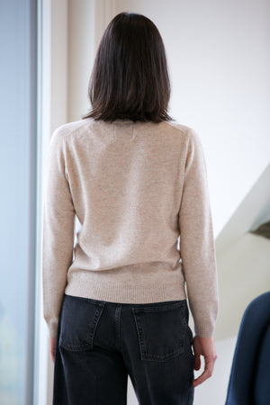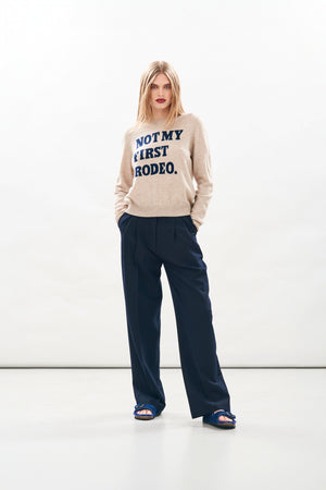 Jumper 1234 cashmere jumper. Cashmere and wool organic light brown crew neck jumper with navy 'not my first rodeo' intarsia. We love a tongue in cheek slogan, and this one ticks all of our boxes. The jumper is true to size.
