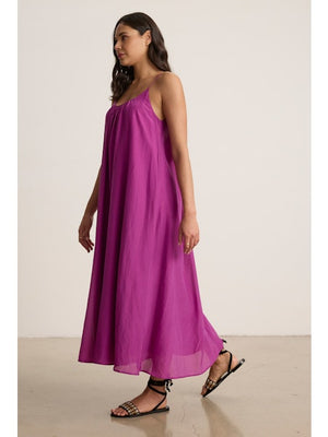 Crafted from silk cotton voile, this dress features a flowing maxi silhouette with delicate thin straps and a scoop neckline. Shirred details on the front and back add soft texture, while a detachable belt allows for a customizable fit. Fully lined for effortless wear, it drapes beautifully with a subtle sheen.