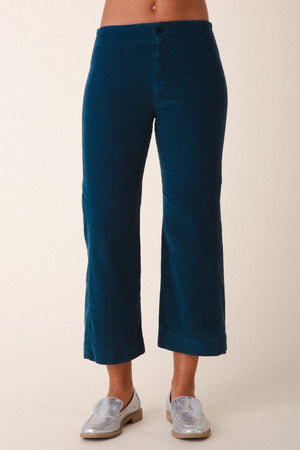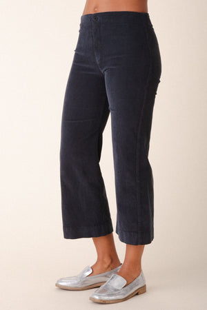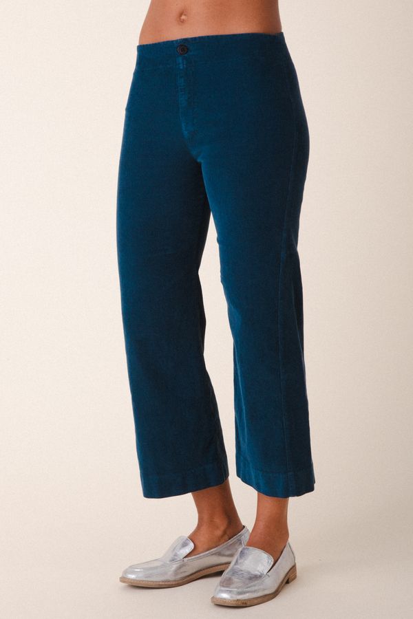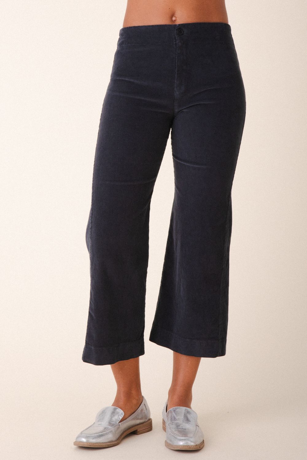 A sleek high-rise, cropped pant made with high stretch corduroy is casual and classic. Two back darts for shaping, and no pockets suggest a minimal look that is also ideal for layering.