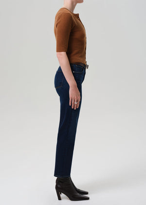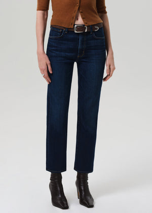 The Caia is a high-rise straight leg designed for everyday ease, crafted from soft stretch denim with a lightweight, flexible feel. The streamlined silhouette sits high on the waist and falls to an ankle-skimming length. The Dakota wash—a dark to medium indigo with subtle fading and whiskering—offers a polished, versatile look. Perfect paired with crisp shirting or easy knits.