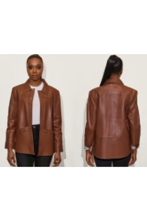 This cropped leather shirt jacket in a rich dark cognac hue offers a perfect layering option for adding style and warmth. Its boxy design ensures a relaxed fit, making it easy to pair with various outfits while keeping you comfortable throughout the day. Ideal for transitional weather, this piece combines timeless appeal with versatile wearability.