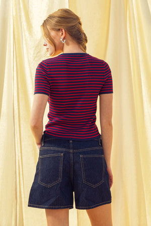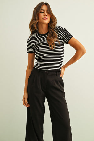 Theodosia Stripe Ribbed Knit SS Top from NYLAND delivers soft, textured style in a lightweight knit—perfect for everyday outfits. Model is wearing size S (Height: 5'7 1/2" / 175.3 cm), showcasing a versatile piece designed for comfort and easy pairing.
