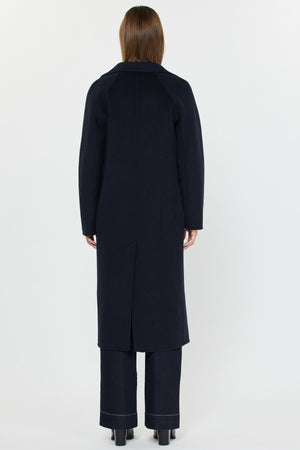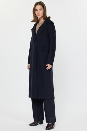 Made from 100% premium wool, this coat delivers luxe softness, insulation, and a refined drape. Its longline silhouette creates a sleek, elongated look that flatters every frame, while the relaxed drape ensures effortless layering over sweaters and dresses.