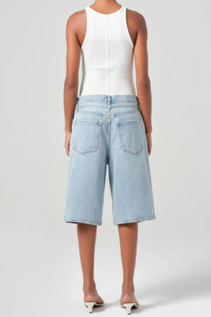 This oversized fit short is not your average pair. It features a long inseam, perfect for a slouchy look, and is cinched with a thin denim belt for added style.