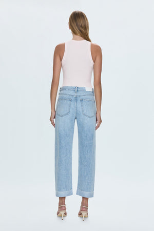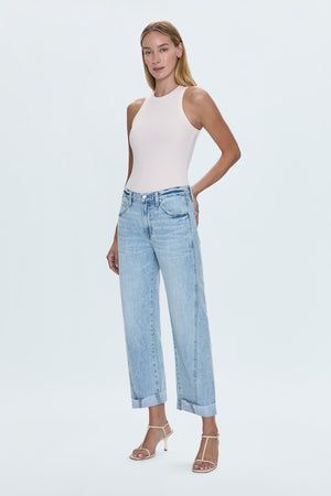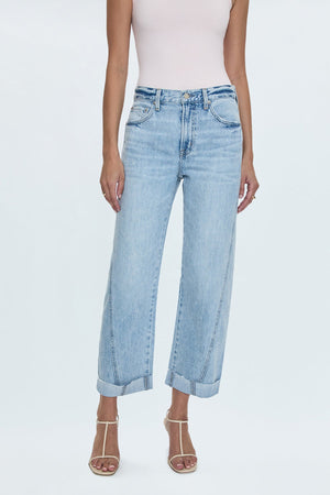 The Kacey Mid Rise Cuffed Boyfriend jeans are your new go-to for effortless style and comfort. This easy fit provides a relaxed yet flattering silhouette, perfect for any occasion. The light denim wash and cuffed hem offer a versatile look that can be dressed up or down, while the seaming detail creates a subtly elongated figure. Made from lightweight rigid denim, the Kacey jeans are going to be a staple piece in your closet.