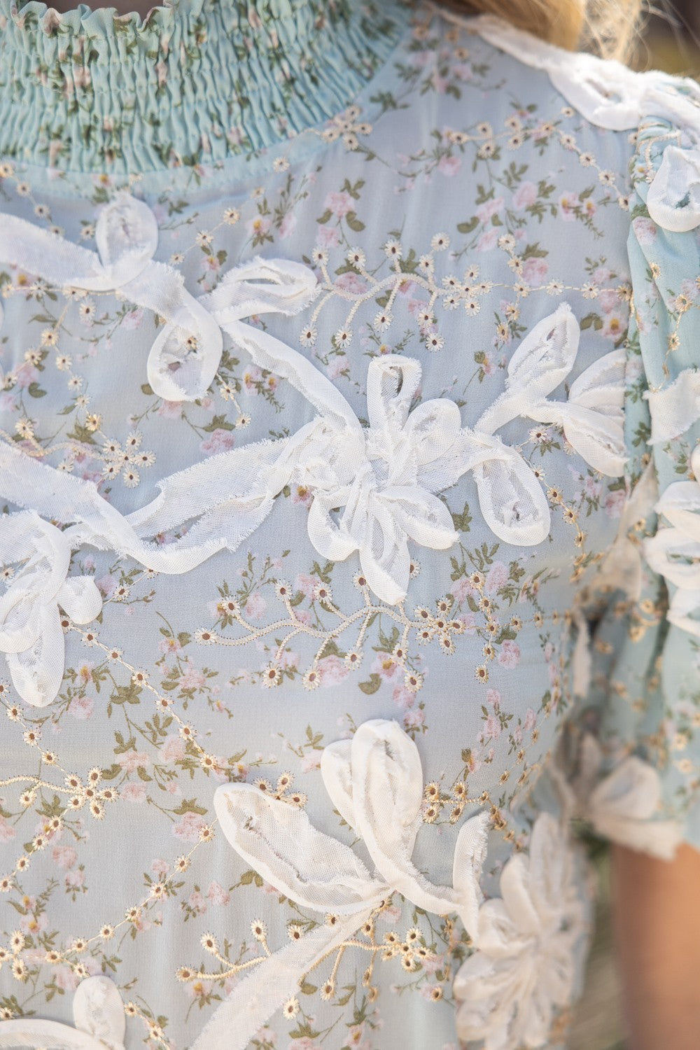 puff sleeves, and dimensional floral appliqué. Its airy, textured design adds elegance to any spring or summer outfit