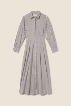 The Emmelie Dress is our vintage-inspired shirt dress with a tailored pleated waist, full-button front and elongating midi hemline. Featuring our signature hidden side pockets and bracelet length sleeves, our most classic fitted shirt dress yet. Shown here in Navy Stripe and made from our soft coastal cotton.