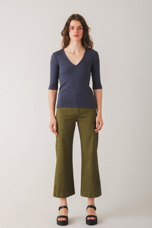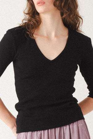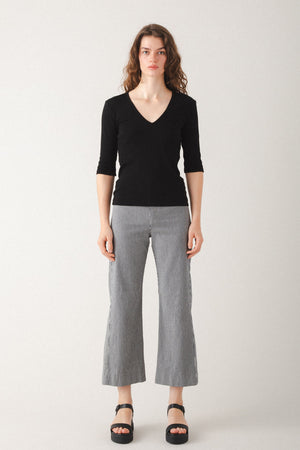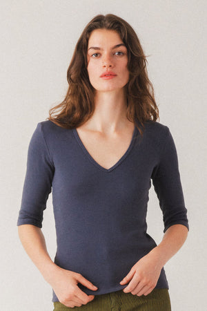 The BB Soft V is named for its baby-soft organic cotton interlock fabric—luxuriously smooth and soft against the skin. Featuring an elegant V-neck and elbow-length sleeves, it offers a sharp, refined silhouette that sets it apart from your everyday tee. The mid-length body is tailored to pair perfectly with high-waisted pants, making it a modern essential. Clean, minimal, and endlessly versatile, it layers effortlessly under jackets or pairs with denim for a timeless, easy look. Everyday comfort meets elevated style.