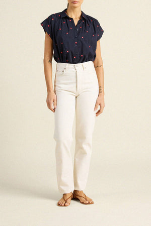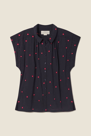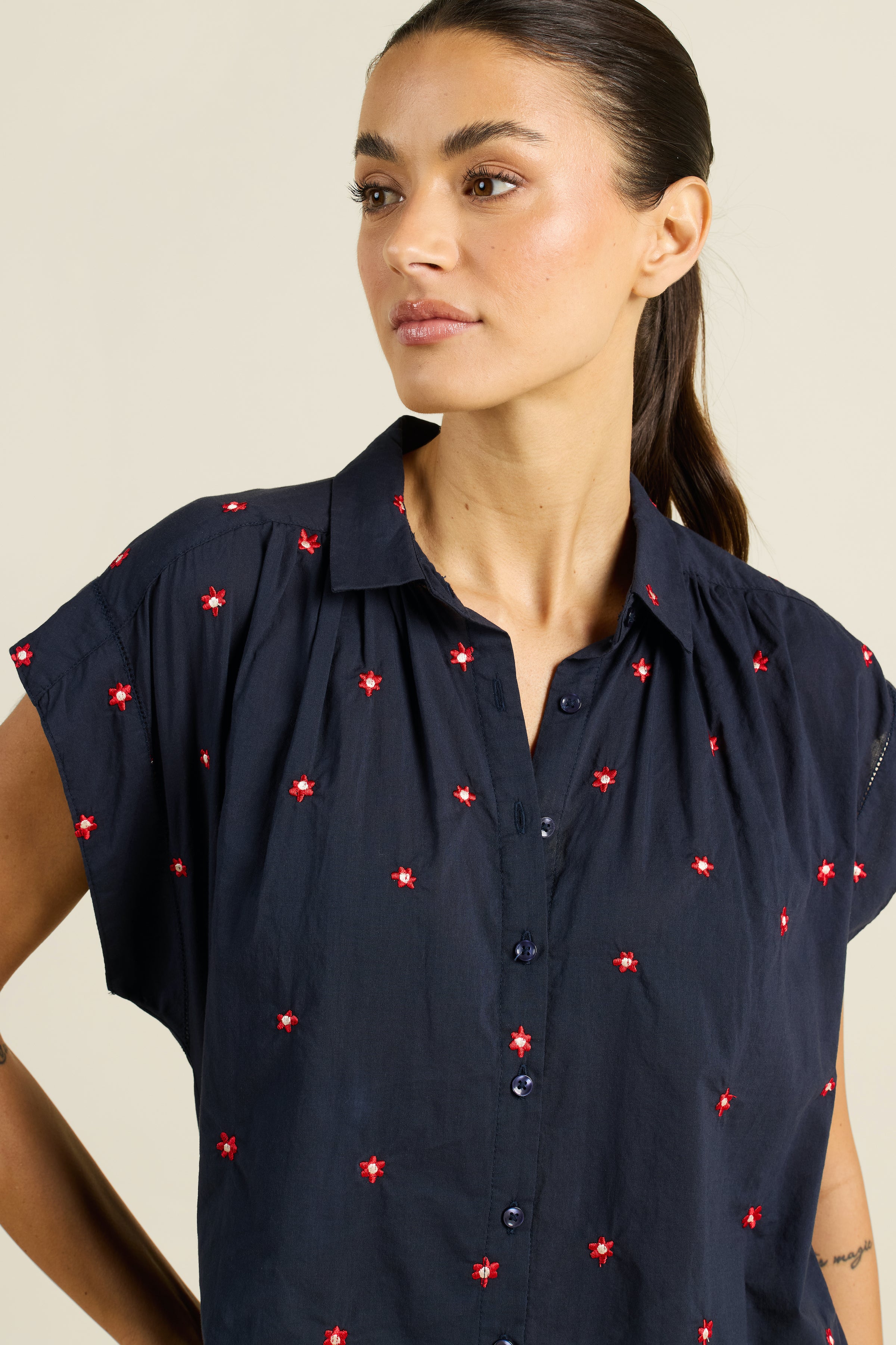The Della Shirt is a new and refined take on our classic Marianne "B" Blouse. Easy gathers at the front and back body highlight the feminine twist of this shirt. The slightly cropped body has short side slits and is completed with out signature antique white buttons. Shown here in Daisy Dot Embroidery and made from our soft cotton.