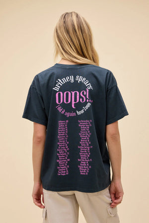 A nod to the album and unstoppable single Spears turned into pop legacy, the iconic artwork from Oops!...I Did It Again hits this Merch Tee tributing the notable sound that defined a generation. The stops of Spears' corresponding 2000 tour are stamped on the back making for a double-sided souvenir. Accented in metallic ink.