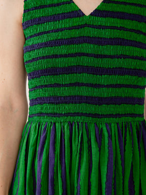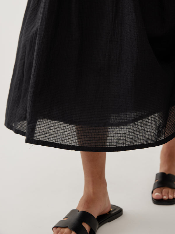 Channel contemporary ease in this black midi dress cut from a lightweight lined cotton in black textured check. This modern update of smocked classics has a sleek v-neckline and hidden pockets: a timeless investment piece ready for summer days and beyond.