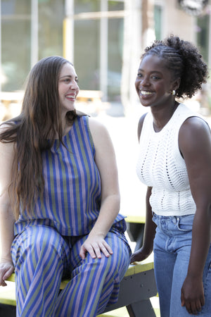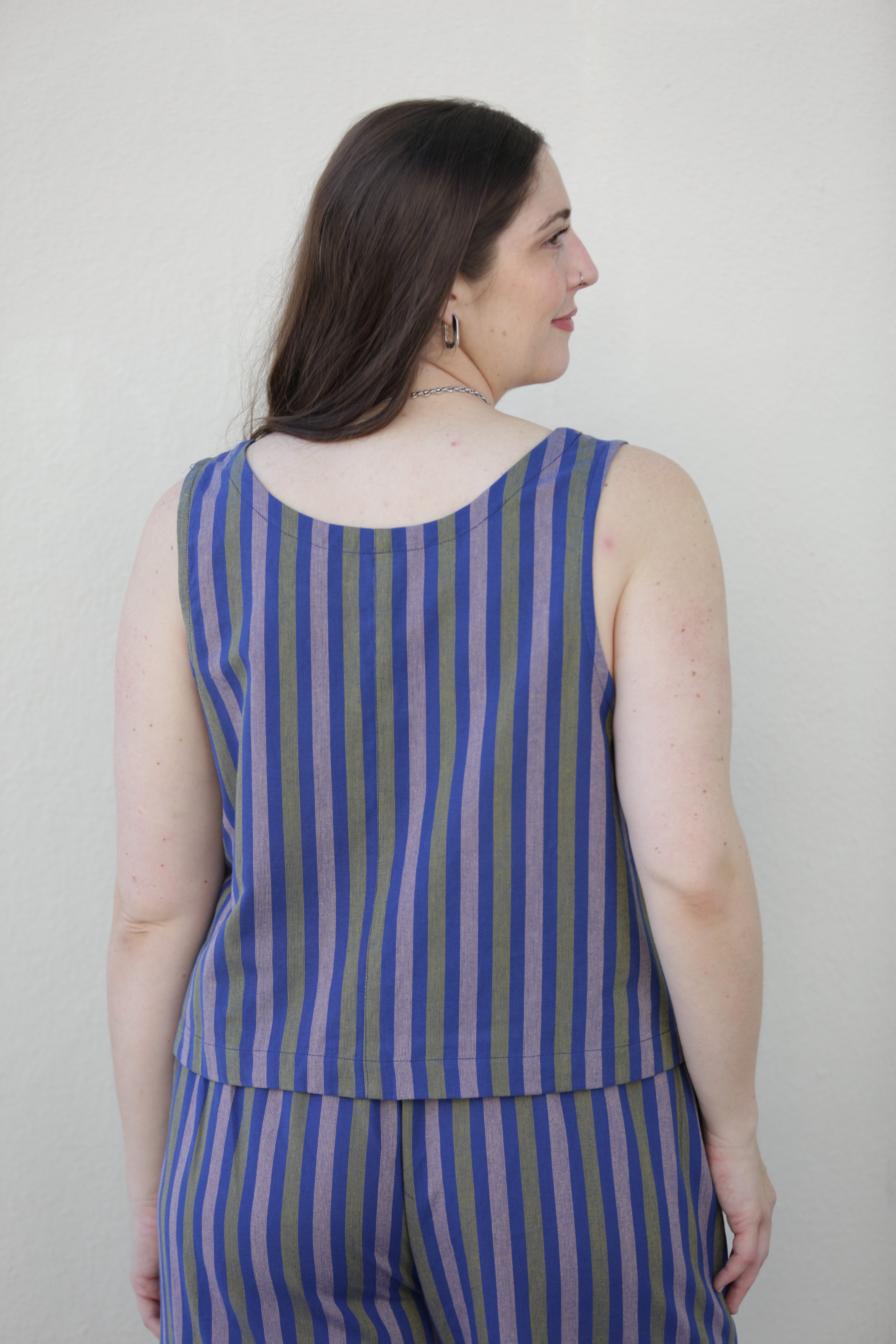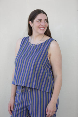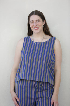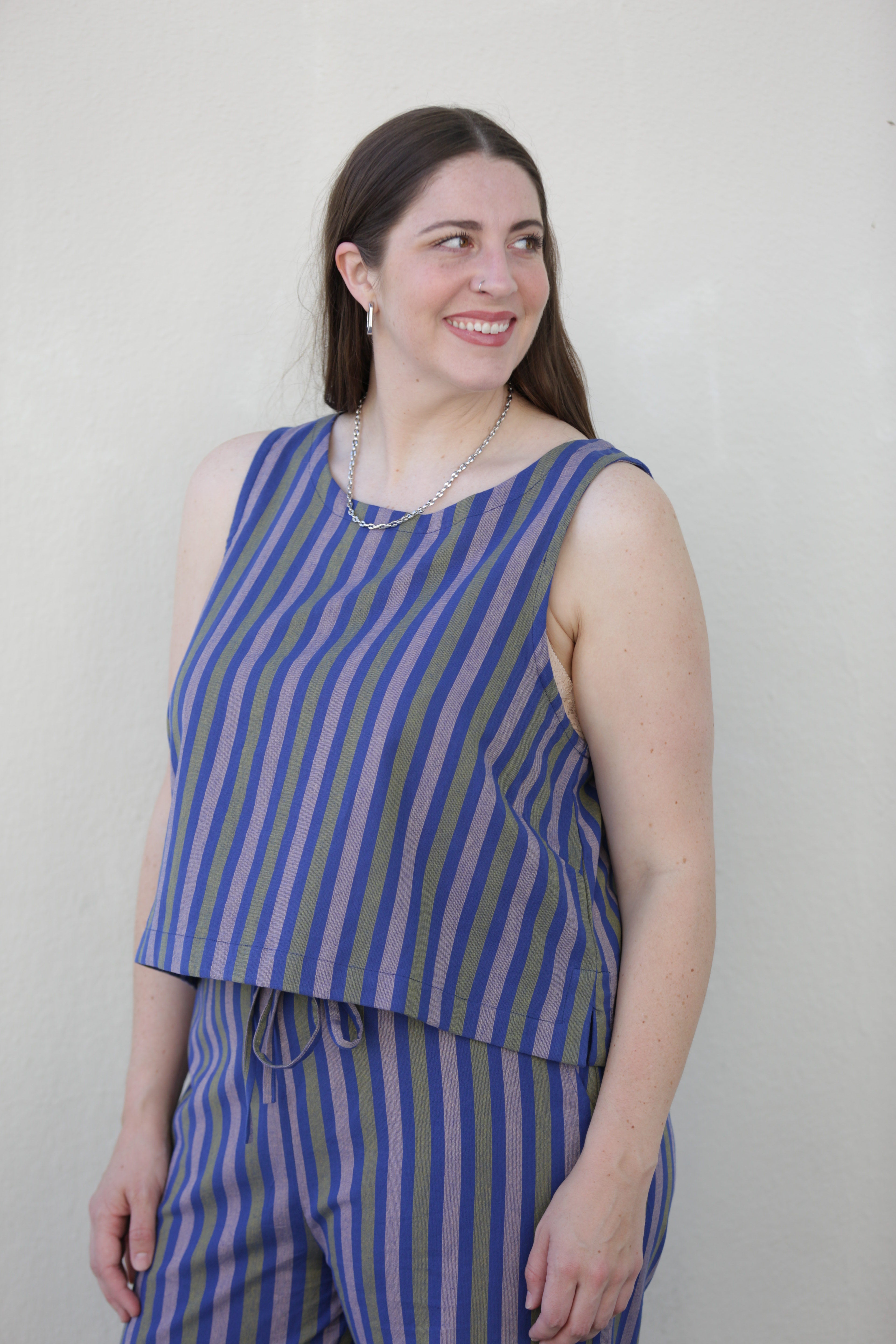 This sleeveless cotton tank is a cool and colorful relaxed summer top; hitting at the low waist, it has a touch of crop for a chic and easy look.