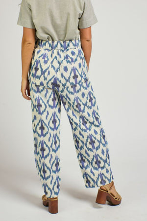 Get the look without any of the hassle? this is an easy pull-on pant, with a flat front, faux fly, elasticated back waist, front slant pockets, and back patch pockets, all cut from a blue and white handwoven ikat.