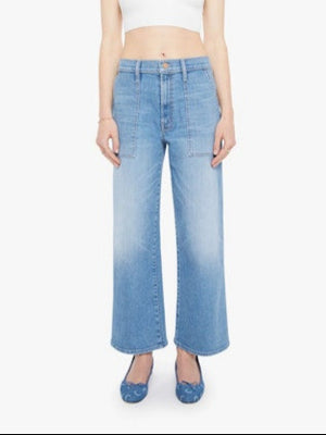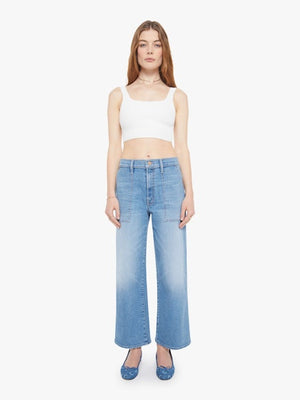 Full throttle. Super high-waisted jeans with a loose fit, wide leg, zip fly, patch pockets and a 28.25-inch inseam with a clean hem. Made from a blend of recycled stretch denim, Ride Hard Live Louder is a light blue with subtle whiskering and fading at the knees.