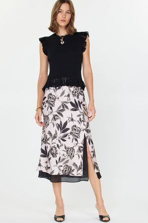 Made from a soft viscose-nylon blend (75% viscose, 25% nylon), it drapes beautifully with a rib-knit body and delicate pointelle detail. The sheer ruffle hem and flutter sleeves add a romantic, airy touch that moves with you.