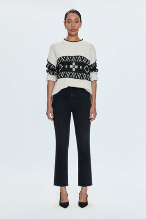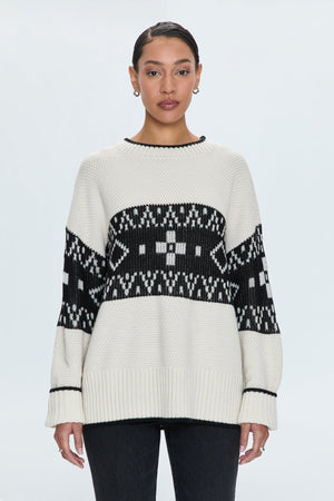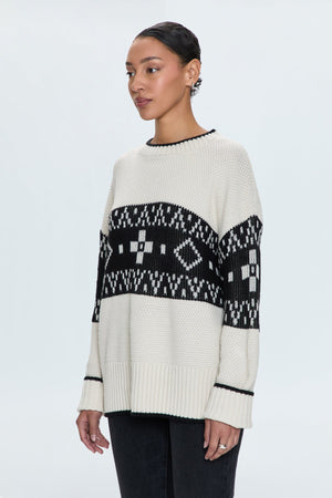 Lofty knit crewneck sweater with long sleeves and a relaxed, oversized fit. Contrasting striping detail at neckline and sleeve ribbing. Offered in a neutral, warm off-white hue with a monochrome, heritage inspired fair isle pattern.