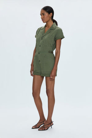 A warm weather rendition of our best selling Grover jumpsuit. Short sleeve romper silhouette designed for a relaxed fit, with a button up bodice and waist for adjustable coverage and fit options, topped with a camp collar neckline.