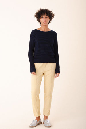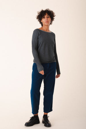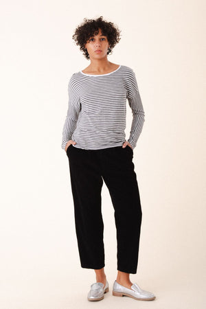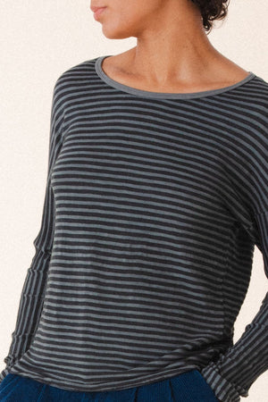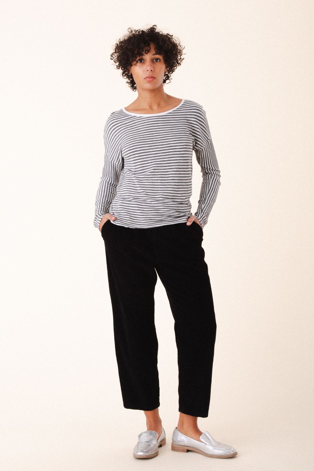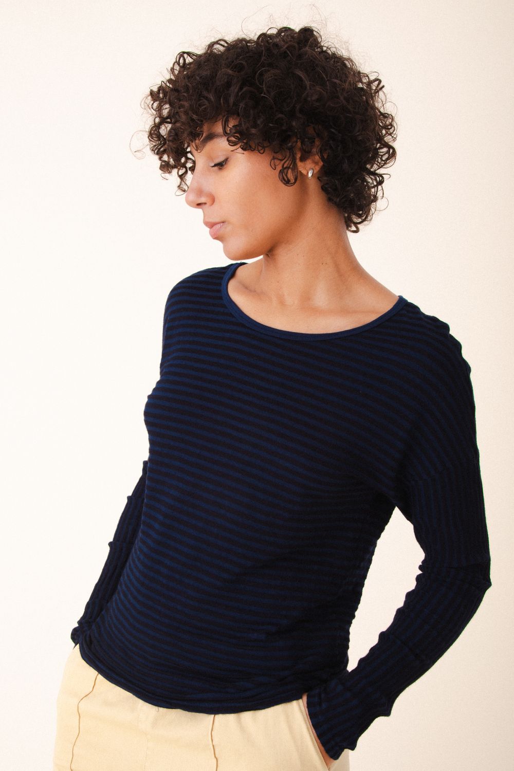 The stripes on this tee, have been cut to form an endless horizon, creating a feeling of expansiveness and motion. It is a complex cut, rigorously minimal, and with a gestural impact. Designed to be worn routinely, this clean, wide-neck tee is a layer in winter months and a perfect t-shirt for the rest of the year.