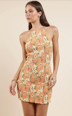 Meet your summer fling: the Aperitivo Smocked Mini Dress. Bursting with vintage-inspired charm, this curve-hugging silhouette features a fully smocked body that stretches comfortably while holding its shape. The floral print—a sun-drenched palette of peach, blush, and olive—is made for warm evenings and clinking glasses.
