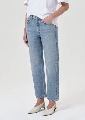 Mid-rise vintage straight with an ankle-grazing inseam, designed with a flattering square top block.