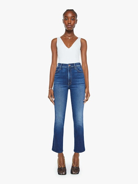 Roll the dice. This bestselling high-rise flare has an ankle-length inseam and a clean hem. Made from stretch denim, Taking Chances is a dark blue wash with whiskering and fading at the knees.