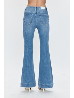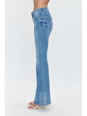 Legs for days. Mid rise waist with a sophisticated ultra-flared leg opening for unquestionably slimming proportions. Offered in our ultra comfortable super stretch denim, in an effortless medium blue wash with fade and whiskering details.