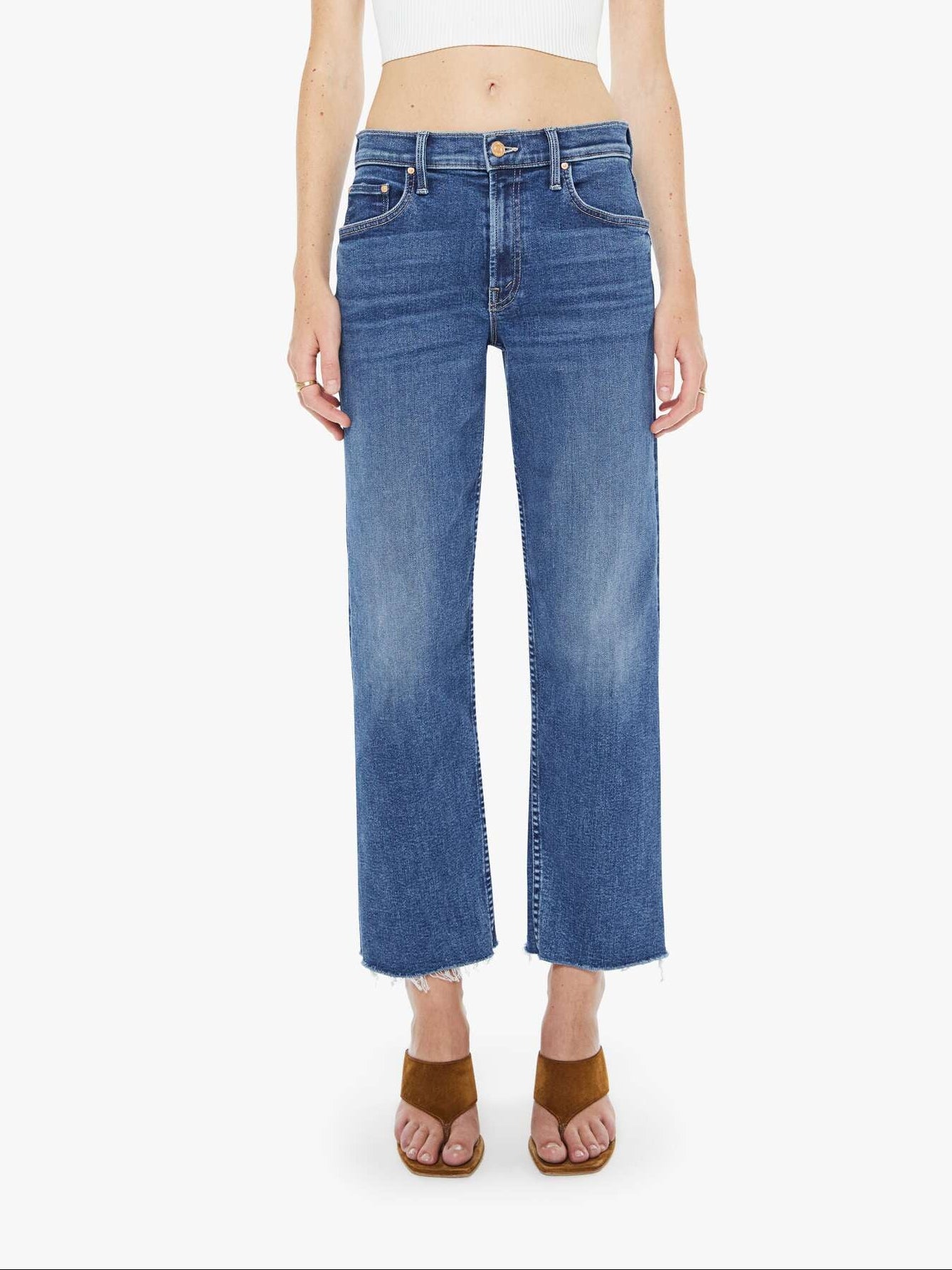 Hidden treasure. Mid-rise straight-leg jeans with a zip fly, ankle-length inseam and a frayed hem. Made from stretch denim, Prized Possession is a mid blue with subtle whiskering and fading at the knees.