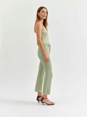 The Shy Girl in Pistachio is a flirty high rise cropped kick flare jean in an optimistic green hue. This earth-toned jean is constructed from our Just Right fabric, a reliably flattering cotton blend that provides the perfect mix of rigid and stretch.