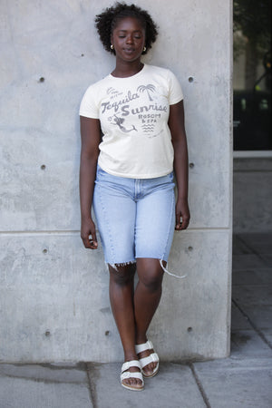 Super high-waisted Bermuda shorts with a wide leg, knee-length inseam and a frayed hem. Cut from semi-rigid SUPERIOR denim, Sow Surreal is a light blue with whiskering and fading throughout.