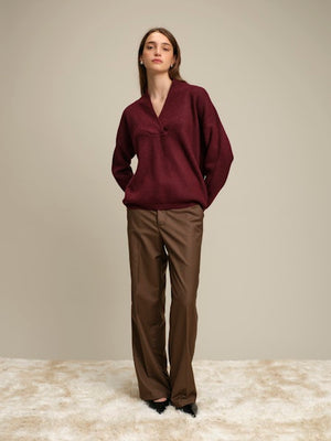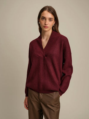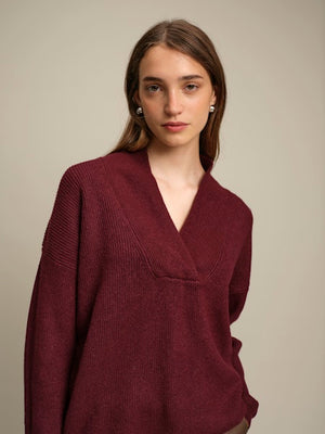 A lightweight long-sleeve wardrobe staple sweater in a flattering v-neck. Now available in fall's hottest wine color.