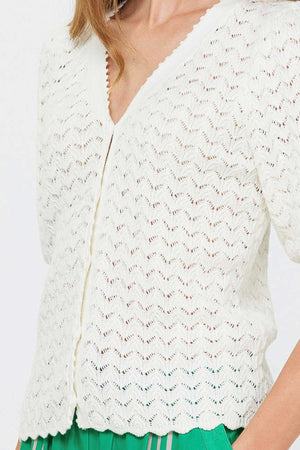 Elevate every season with the NYLAND Josette V-Neck Scalloped Cardigan Sweater, a soft, feminine layer built for comfort and charm. The airy open-knit texture creates a delicate silhouette, while scalloped edges add a touch of romantic detail. Designed for effortless layering through spring and summer, this cardigan transitions from sunny afternoons to breezy evenings with ease.