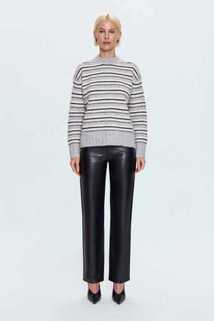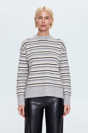 A modern essential, Hanna features an oversized fit that drapes effortlessly while maintaining its shape for a balance of comfort and structure. Knit from a wool-cotton blend, it’s soft yet substantial—perfect for layering or wearing solo. Variegated stripes in Grey White bring subtle texture and a graphic, contemporary finish.