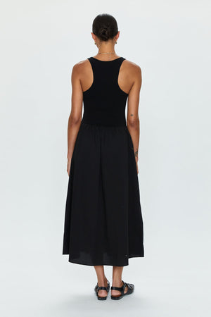 Rooted in elevated ease that dresses up or down for endless wearability. Designed with a compact tank style bodice that falls into a flounced, wide skirt with a midi length hem.