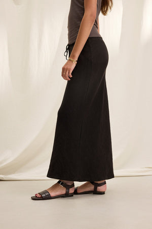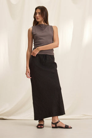 This maxi skirt is crafted from heavy linen, offering a structured yet flowy silhouette. Designed with a bias cut for added movement, it features a drawstring elastic waist for a comfortable and adjustable fit.