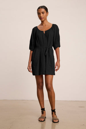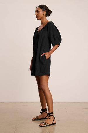 Designed with a deep scoop neck and puff sleeves, this dress offers a flattering silhouette with its side seam patch pockets and detachable belt for an adjustable fit. Crafted from woven linen, it delivers both comfort and a chic, relaxed look perfect for day-to-night wear.