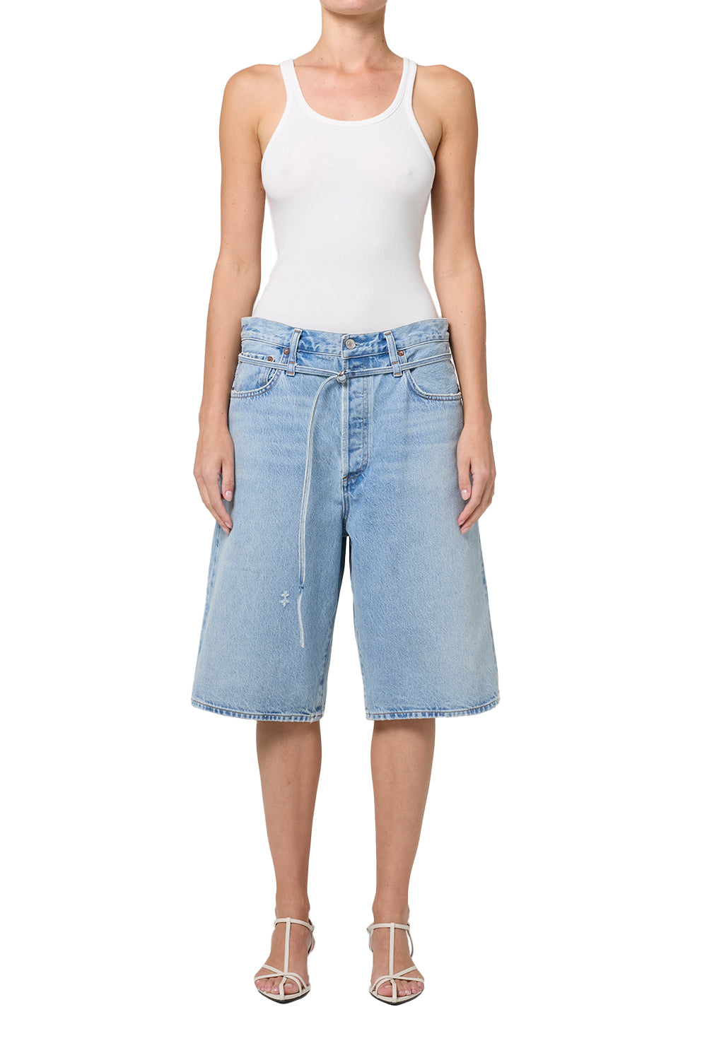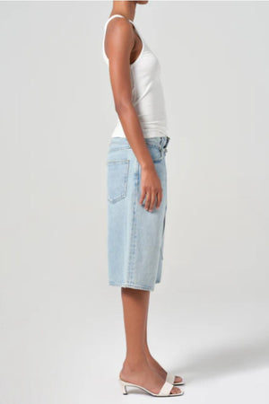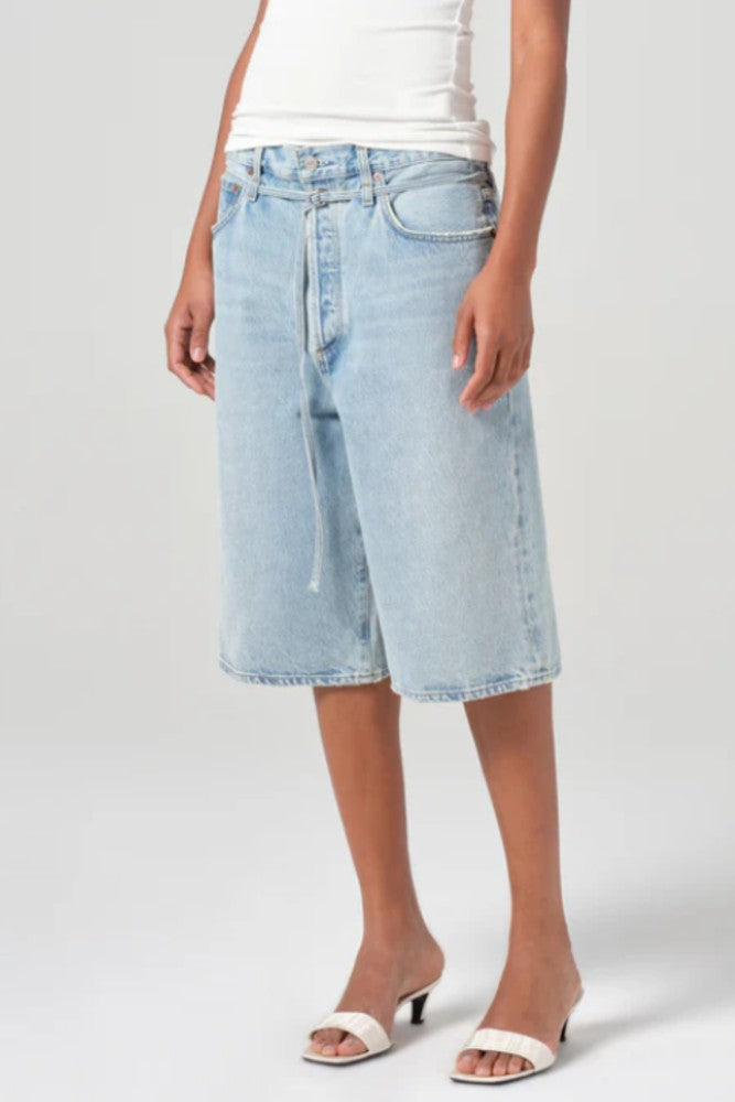 This oversized fit short is not your average pair. It features a long inseam, perfect for a slouchy look, and is cinched with a thin denim belt for added style.