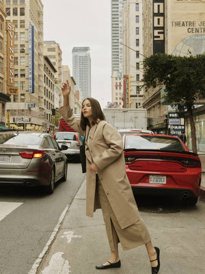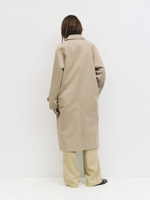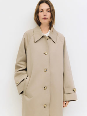 The Serena Coat blends timeless tailoring with contemporary ease, featuring a pointed collar and raglan sleeves for a relaxed yet refined silhouette. Finished with adjustable cuffs, welt pockets, and a back slit, this midi-length trench coat is designed for effortless layering.