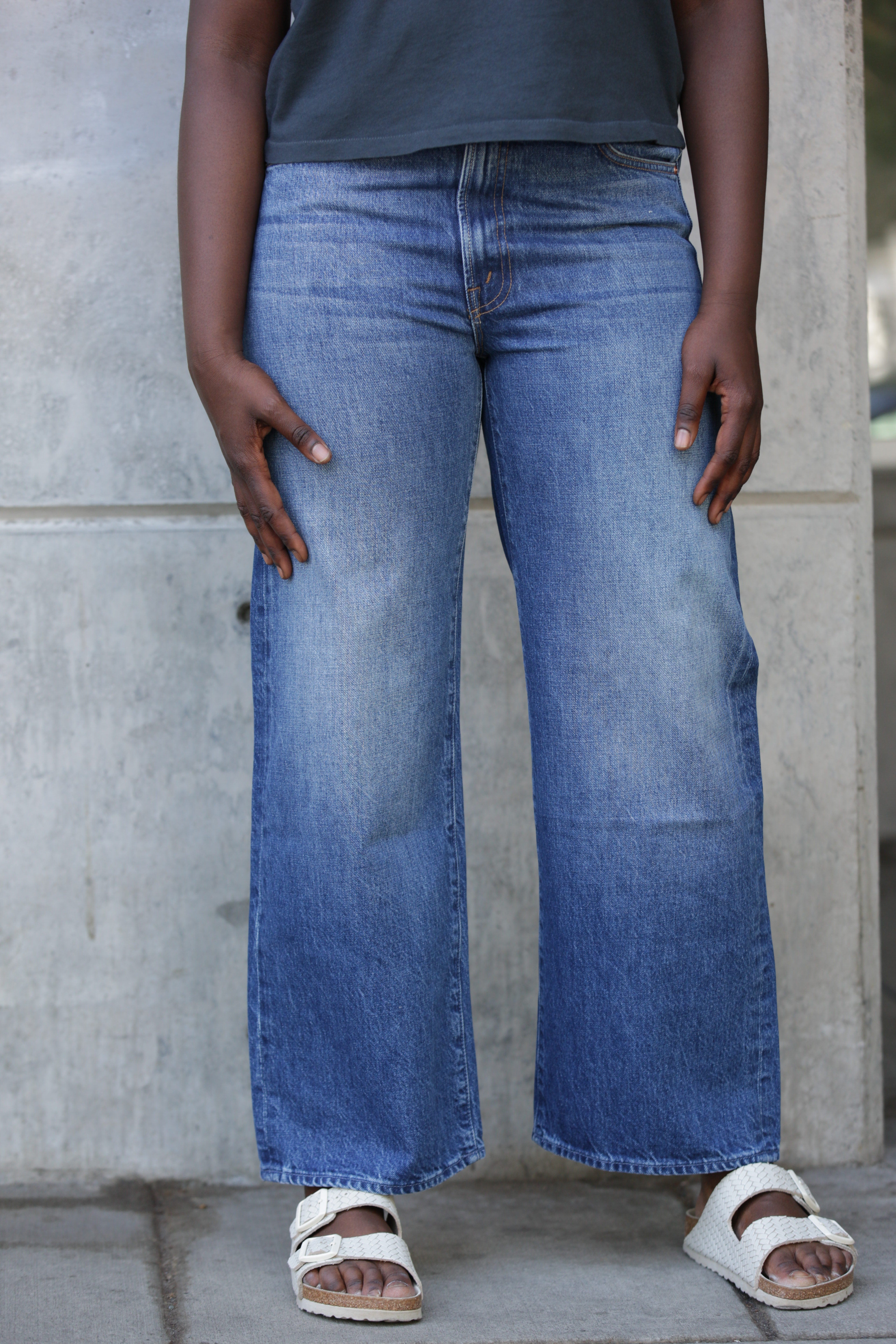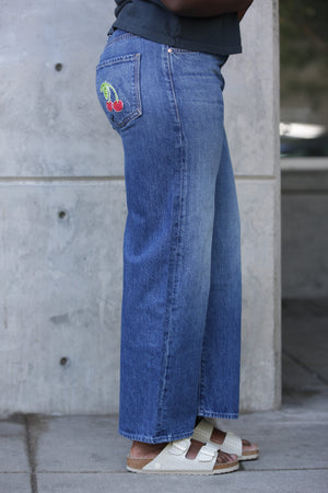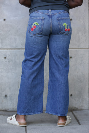 Plant whisperer. Jeans designed to sit lower on the hips with a loose wide leg and an ankle-length inseam. Cut from rigid SUPERIOR denim, Green Thumb is a classic mid-blue with subtle whiskering, fading.