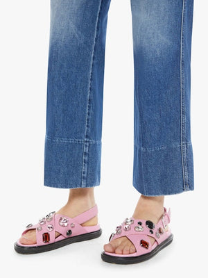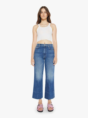 These are high-waisted, wide-leg ankle-length jeans from the brand Mother, in the "Rags to Riches" wash, which is a light blue denim with subtle whiskering and fading, giving a classic worn-in look; "Wide Hem" indicates the jeans have a wider hem at the ankle, adding to the relaxed silhouette.