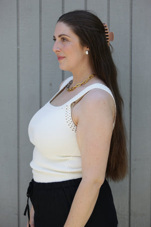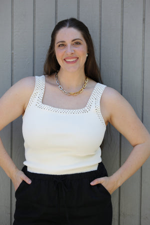 The NYLAND Monet Square Neck Sweater Tank Top w/ Crochet Detail is a sleek, versatile essential that elevates every look. Clean lines meet delicate crochet trim for a piece that feels refined yet effortless.